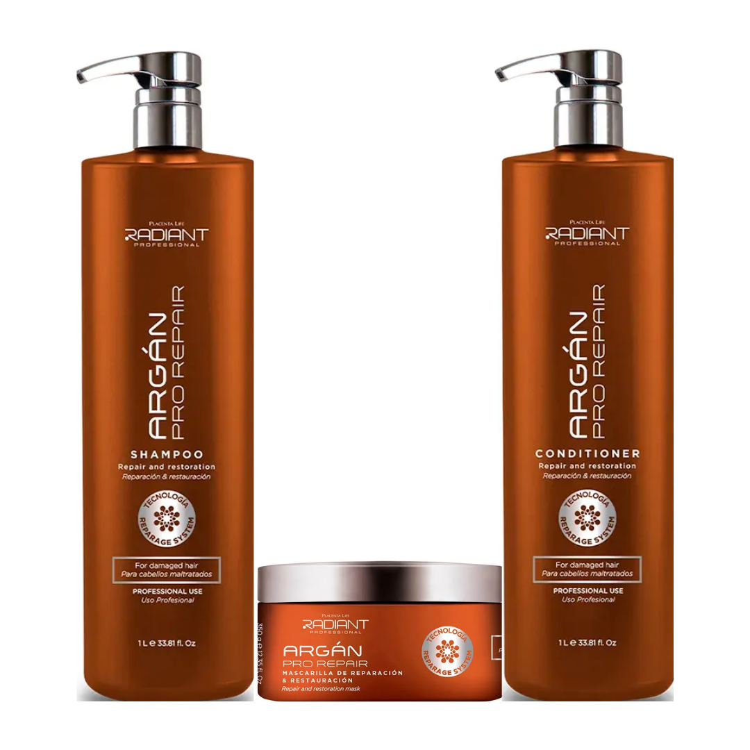 Tripack Radiant Argan Pro Repair Shampoo 1Lt + Acondicionador 1Lt + Mascarilla 350gr